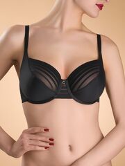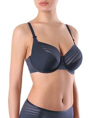 Бюстгальтер с мягкой чашкой, с тройным диагональным членением, на каркасах. Боковые детали стана на подкладке. Завершающий элемент композиции - металлическая подвеска в виде буквы С.