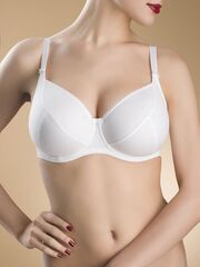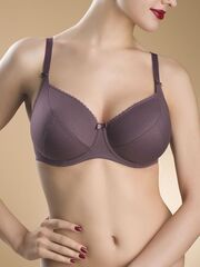 Бюстгальтер с мягкой чашкой с тройным диагональным членением, на каркасах. Чашка из неэластичного жаккардового полотна. Декоративная тесьма по линии декольте.