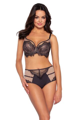 Бюстгальтер выполнен в цвете Cold Espresso, на косточках, чашки шитые, внутренняя сторона чашек и спинка проложены тонкой сеткой телесного цвета, внешняя покрыта кружевом с ресничками. Пояс бюстгальтера с дополнительными боковыми поддержками, визуально вытягивает силуэт, плотно облегает тело и обеспечивает стабильную комфортную посадку бюстгальтера на фигуре. Бретельки несъемные, регулируются по длине, фурнитура металлическая цвета меди. На спине застёжка на удлинитель (3 крючка в размерах 65DEF, 70CDE, 75BCD, 80BC, 85B, в других размерах 5 крючков). Мягкие чашки этого уникального бюстгальтера ложатся на изгибы груди как вторая кожа, а нежное кружево, покрывающее всю конструкцию, создает иллюзию чувственного плетения.