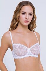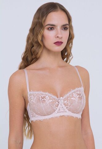 Модель с легкими, полупрозрачными чашками из изысканного шитья по ажурной сетке. Благодаря оригинальному крою чашек с двумя разнонаправленными вытачками бюстгальтер создаёт идеальную округлую форму груди.
