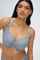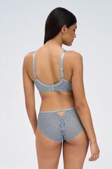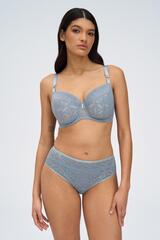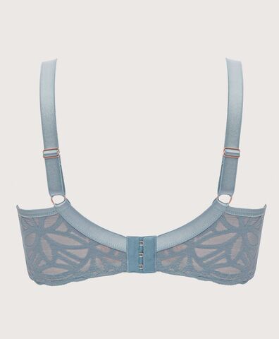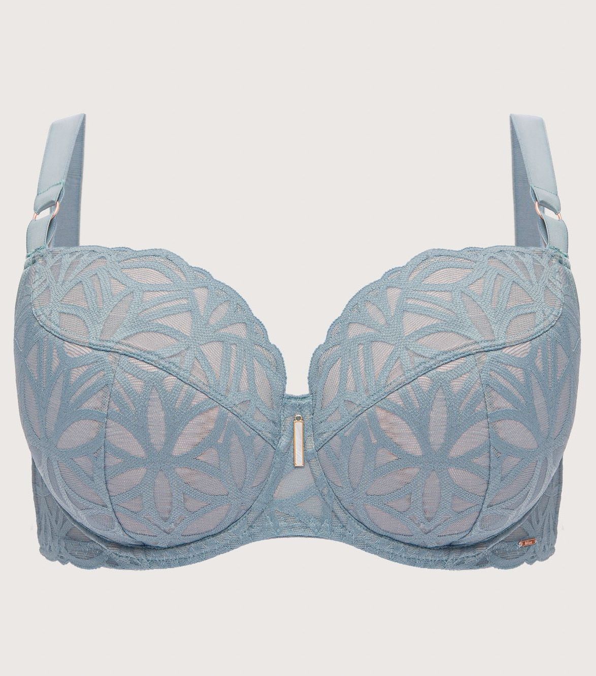 Бюстгальтер Salt&Sea PU выполнен на косточках с дополнительными боковыми поддержками, чашки шитые, нижняя часть на тонком поролоне телесного цвета, с внешней стороны из кружева с геометрическим узором, внутренняя сторона проложена хлопковым трикотажем, верхняя часть кружевная, пояс кружевной продублирован эластичной телесной сеткой. Бретельки не отстёгиваются, регулируются по длине. На спине застёжка на удлинитель, количество крючков в ряду застёжки, увеличивается пропорционально размеру бюстгальтера, фурнитура металлическая цвета розового золота. Между чашек продолговатое украшение, покрытое перламутром, привлекает взгляды, подобно световым бликам на поверхности воды.