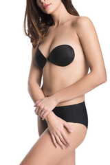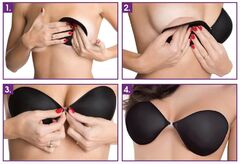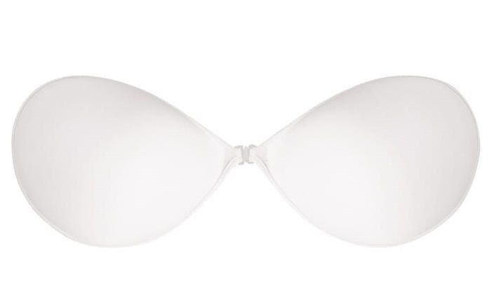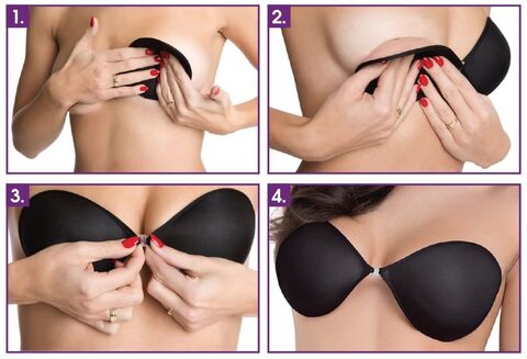 Бюстгальтер силиконовый самоклеящийся без бретелек, спереди пластмассовая застёжка, чашки покрыты микрофиброй. Собирает грудь, невидим под одеждой, при хорошем уходе возможно использовать до 60 раз.