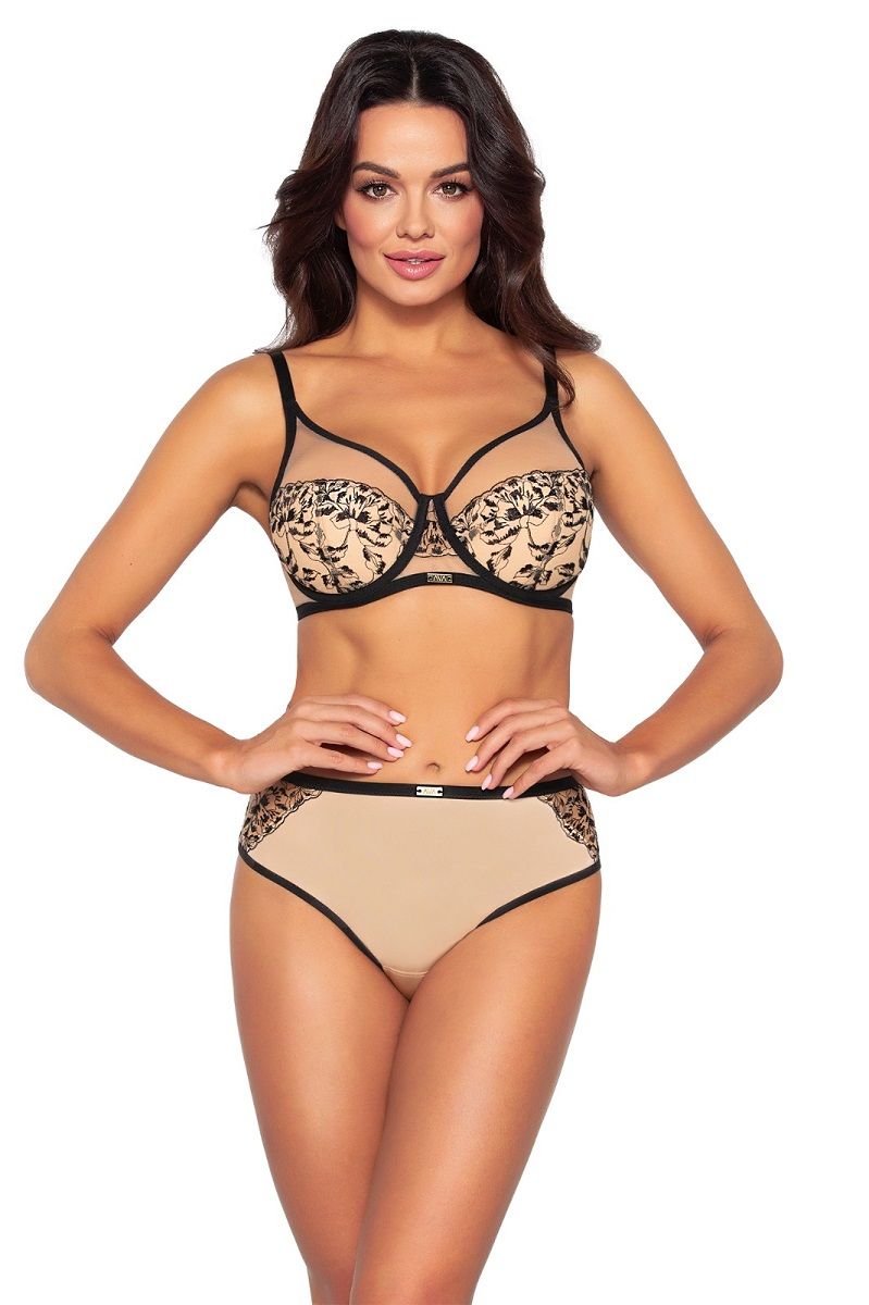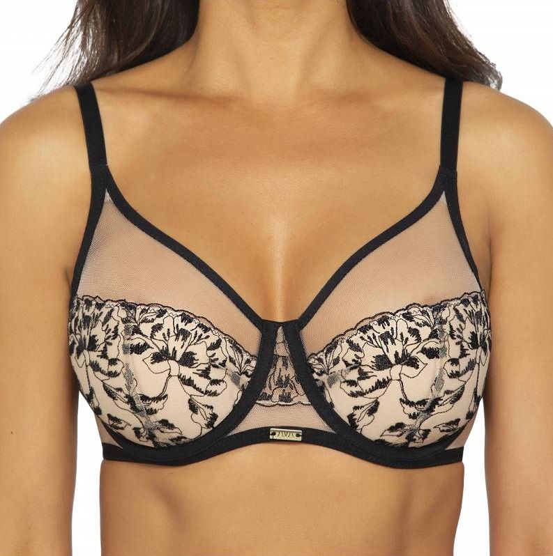 Бюстгальтер с шитыми чашками на косточках, нижняя часть чашки из тонкого поролона, с внешней стороны из сетки с тонкой цветочной вышивкой, незаметно скрывающей то, что должно быть скрыто, верхняя часть чашки из двух слоев сетки. Окантовка косточек на чашках, резинки и бретели контрастного черного цвета, пояс из эластичного сетчатого полотна. Бретельки регулируются по длине, не отстёгиваются. На спине застёжка на удлинитель, количество крючков в ряду 2. Фурнитура металлическая цвета желтого золота. Благодаря популярному дизайну грудь получает идеальную поддержку, а идеально скроенные чашки придают ей естественную округлую форму. У бюстгальтеров/купальных лифов AVA довольно тугой пояс, который адаптируется под тело после нескольких дней носки или одной-двух стирок. Рекомендуем использовать удлинитель пояса бюстгальтера на первое время либо выбирать следующий за «своим» размер, с поясом длиннее.