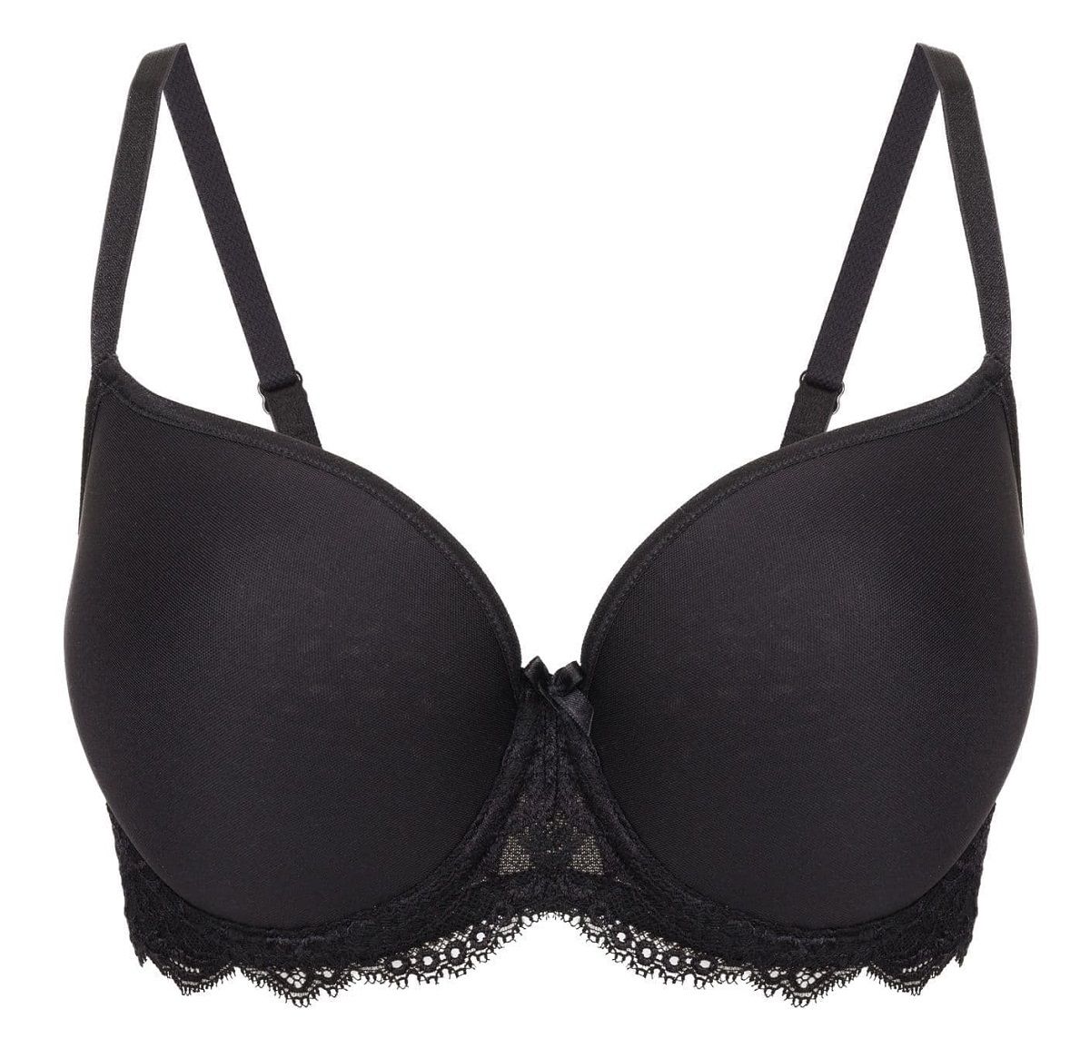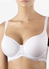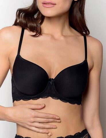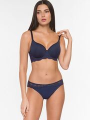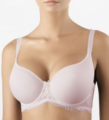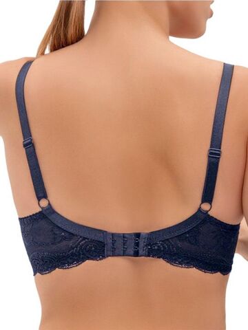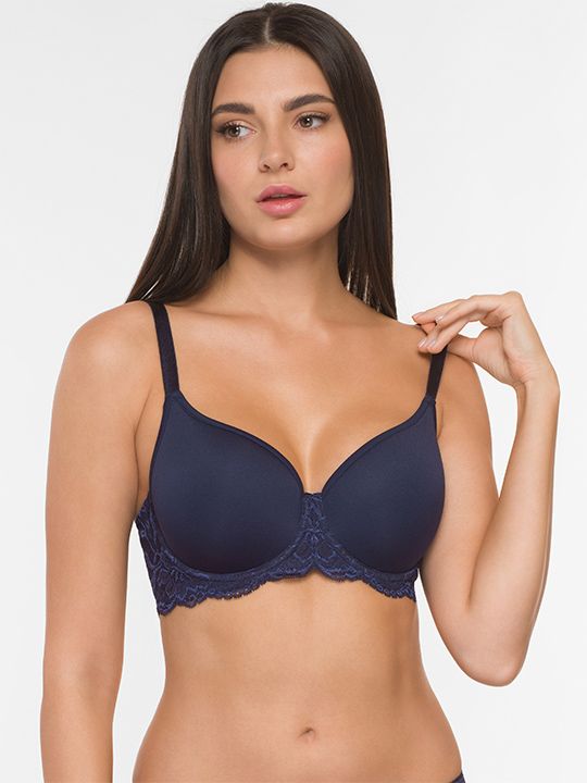 Бюстгальтер с формованными чашками-спейсер на каркасах в кружевном стане с заниженной серединкой и открытой линией декольте. Создает естественный круглый силуэт.