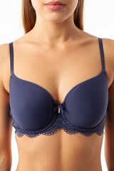 Бюстгальтер на каркасах с бесшовными формованными чашками из 3D материала Spacer (Спейсер). Под термином «Spacer» понимается очень легкий и дышащий материал, приятный на ощупь, прекрасно держащий форму. С внутренней стороны чашки укреплены подкроем из неэластичного сетчатого полотна. Стан бюстгальтера выполнен из эластичного кружева и дублирован эластичной сеткой. Бюстгальтер украшен атласным бантиком с подвеской из страз.