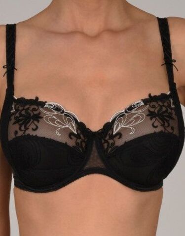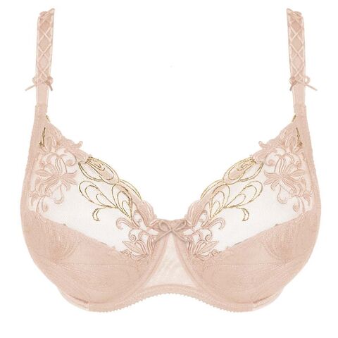 Классический бюстгальтер с мягкими чашками на каркасах и боковым подкроем. Чашки из полупрозрачного тюля с вышивкой, безупречная посадка и изысканные детали — таковы главные достоинства этой модели. Рельефная вышивка придает индивидуальность этой соблазнительной линии. Богатство вышивки барокко, смешивающей цветы и арабески, привносит очарование соблазнения, ощущение детализации исключительного белья. Тема, широко доступная в формах и цветах для элегантной коллекции, посвященной любителям красивого французского нижнего белья.