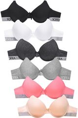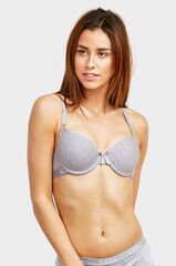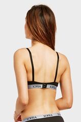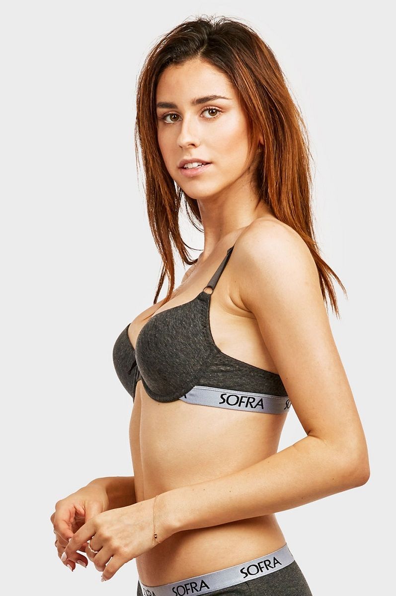 Бюстгальтер с формованными поролоновыми чашками на узком соединении, из мягкого комфортного трикотажа с содержанием хлопка. Нижний край боковых панелей обработан широкой резинкой с контрастными логотипом. Классические бретели с сатиновым блеском перекликаются с лаконичным бантиком по центру. Бретели регулируются спереди для удобства.