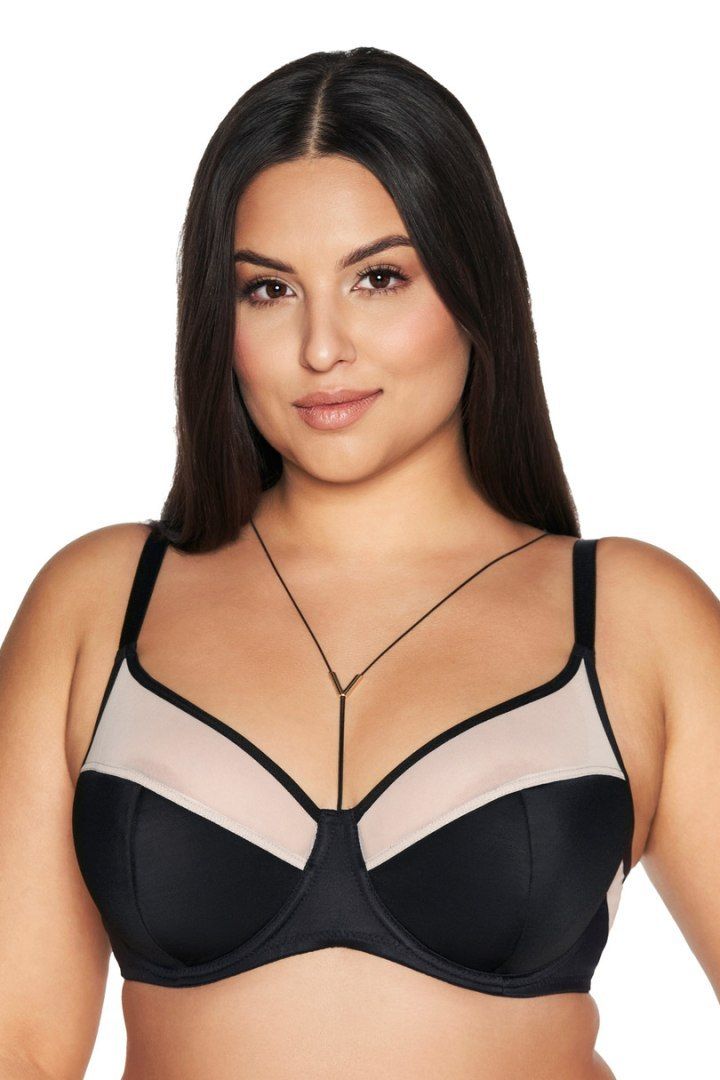 Бюстгальтер Viva выполнен на косточках, чашки шитые, нижняя часть на тонком поролоне, с внутренней стороны проложена хлопковым трикотажем, внешняя сторона гладкая, верхняя часть чашки из телесной сетки. Пояс сшит из плотной стабилизирующей черной сетки с геометрическими вставками телесной сетки по бокам. Бретельки регулируются по длине, не отстёгиваются. На спине застёжка на удлинитель на 2 крючка, фурнитура металлическая цвета желтого золота. В зоне декольте несъемная тонкая эластичная резинка с подвижным металлическим аксессуаром в виде буквы V. У бюстгальтеров/купальных лифов AVA довольно тугой пояс, который адаптируется под тело после нескольких дней носки или одной-двух стирок. Рекомендуем использовать удлинитель пояса бюстгальтера на первое время либо выбирать следующий за «своим» размер, с поясом длиннее.
