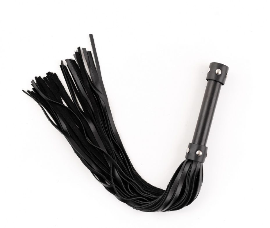 Плеть выполнена из натуральной кожи черного цвета. Имеет ручку, которую комфортно держать в руке и 23 мягких хвоста. Этот аксессуар поможет получить удовольствие и совместить строгость вашего образа с нежностью. Длина рукоятки - 16 см.