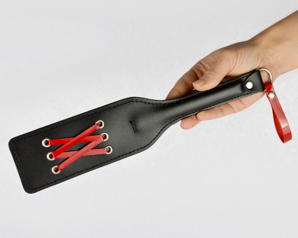 Шлепалка изготовлена из натуральной кожи, имеет жесткую рукоять и декорирована с одной стороны красной лаковой лентой. Длина ударной части - 13 см., ширина - 6 см.