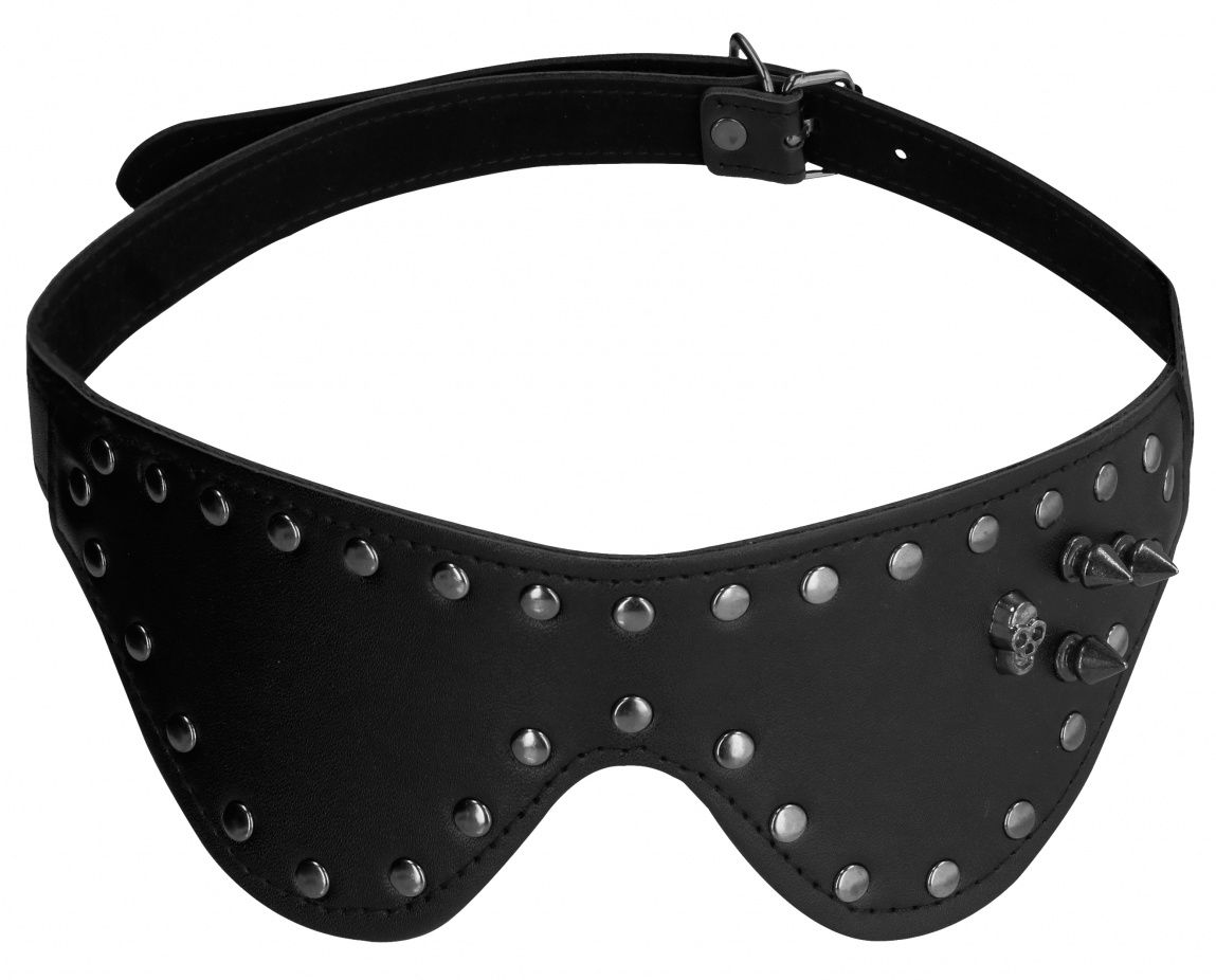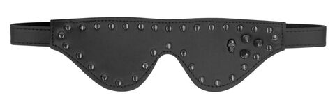 Черная маска, декорированная металлической фурнитурой, размер регулируется застежкой. Ширина - 7 см.