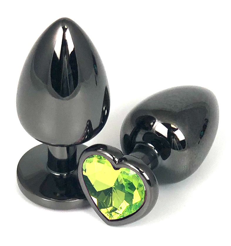 Черная металлическая анальная пробка с лаймовым стразом-сердечком - 7,5 см.