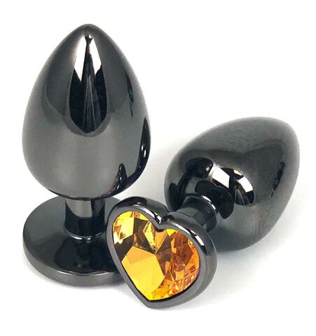 Черная металлическая анальная пробка с оранжевым стразом-сердечком - 7,5 см.