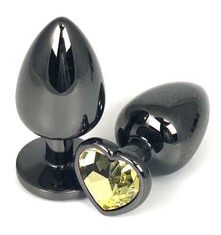 Черная металлическая анальная пробка с желтым стразом-сердечком - 9 см.