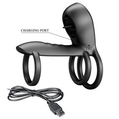 Черная насадка на пенис с 12 режимами вибрации Jammy. Фиксация на мошонке при помощи кольца. Клиторальный стимулятор с функцией движения язычка. Диаметр колец - 3,2, 3,2 и 5 см.