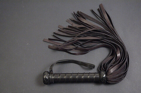 Плеть толстая, обвитая красной кожей с декоративными кожаными плетенными бобышками и петлей для фиксации на руке. 35 полос средней жесткости кожи с прямым резом на концах.