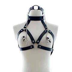 Черная портупея на грудь с кляпом и зажимами для сосков