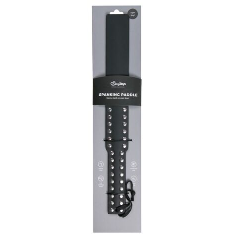Черная шлепалка для эротических игр c заклепками по периметру рукоятки. Имеет петлю на конце ручки для удобного использования. Изготовлена из эко-кожи. Ширина - 5 см.