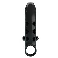 Черная вибронасадка на пенис с подхватом мошонки. Насадка удлиняет член, добавляет ему толщины. Обеспечивает партнёрше массаж клитора при глубоких проникновениях.