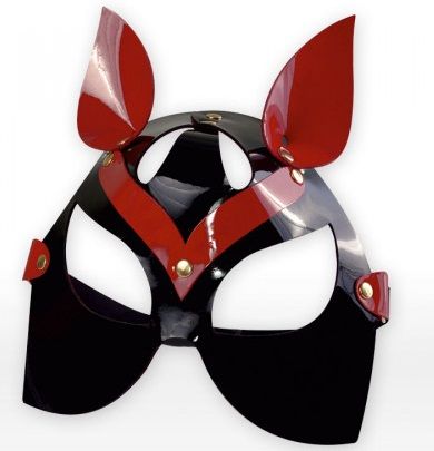 Маска кошки из черной и красной натуральной лаковой кожи с миндалевидными прорезями для глаз, украшенная металлическими заклёпками золотистого цвета. Для максимального комфорта маска имеет бархатистую велюровую подкладку, обеспечивающую приятные тактильные ощущения при соприкосновении с кожей лица. Фиксирующая резинка с пряжкой позволяет легко регулировать размер изделия.