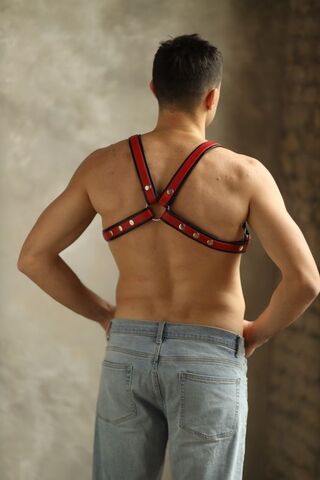 Яркая и стильная, очень качественная мужская портупея, полностью выполненная из натуральной кожи. Лицевая часть выполнена из красной кожи, а подклад - из черной, очень мягкой и приятной к телу. Фиксация происходит с помощью кнопок, что позволяет легко и удобно регулировать посадку аксессуара по фигуре. Портупея декорирована надежными сварными металлическими кольцами, к которым можно при желании пристегивать дополнительные аксессуары и комбинировать в разных вариантах. Портупея двусторонняя: ее можно носить по разному, меняя положение.