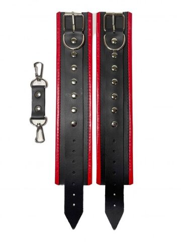 Красивые и функциональные наручники, выполненные из искусственной кожи. Декорированы металлической фурнитурой и красными вставками по краям. Обхват удобно регулируется с помощью пряжек. В комплекте идет соединение с карабинами. Очень экономичный, экологичный и практически незаменимый аксессуар для вашей любовной игры! Ширина - 5,5 см.