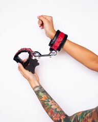 Стильные наручники из натуральной кожи премиум качество с соединительными карабинами из нержавеющей стали. Наручники дополнены дизайнерскими вставками в виде небольших металлических колец. Размер наручников легко регулируется с помощью застежки. Наручники изготовлены для БДСМ игр и фиксации рук. Для того, чтобы можно было рассмотреть вид и качество товара, он упакован в прозрачный пакет. Обхват - 26-29 см.