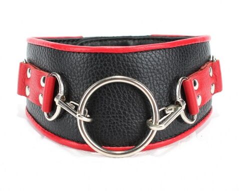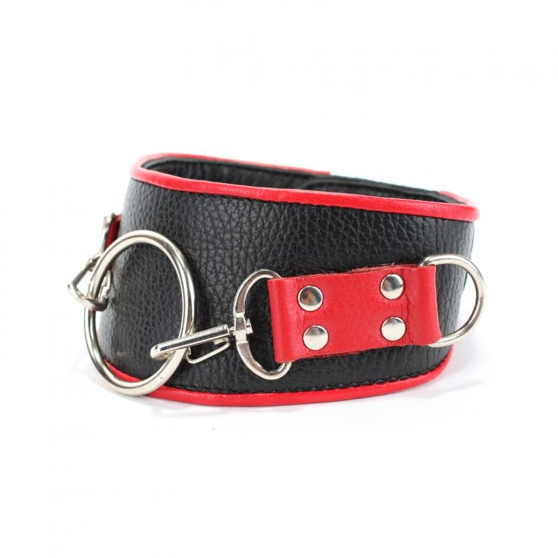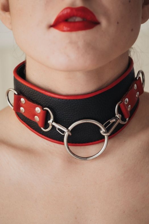 Ошейник выполнен из качественной натуральной кожи черного цвета . Аксессуар декорирован металлическим кольцом на двух карабинах, вставками из красной кожи, заклепками. Ошейник фиксируется металлическими кнопками, позволяющими подобрать нужный размер, подойдет на обхват шеи от 30 до 36 см. Мягкий подклад обеспечивает комфорт, помогая полностью погрузиться в БДСМ игру. Ширина - 6 см.