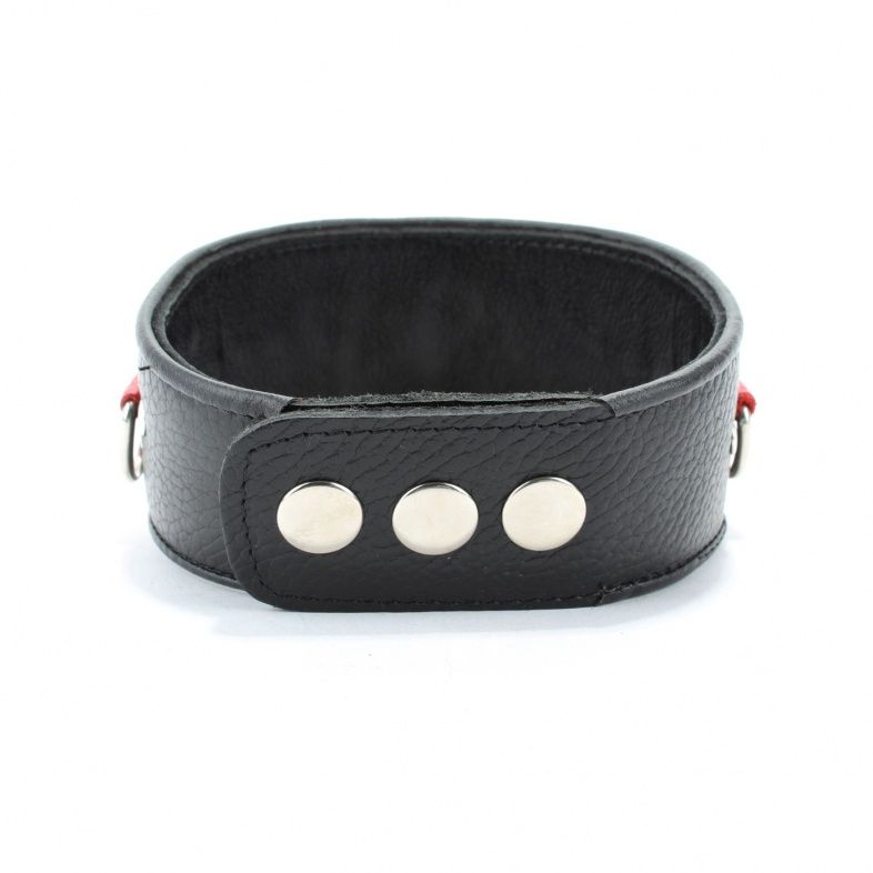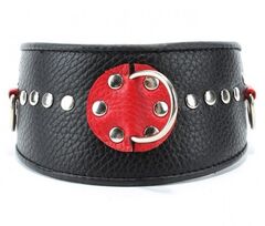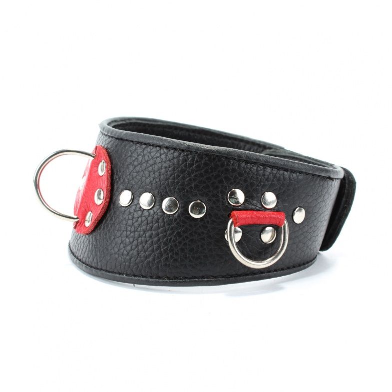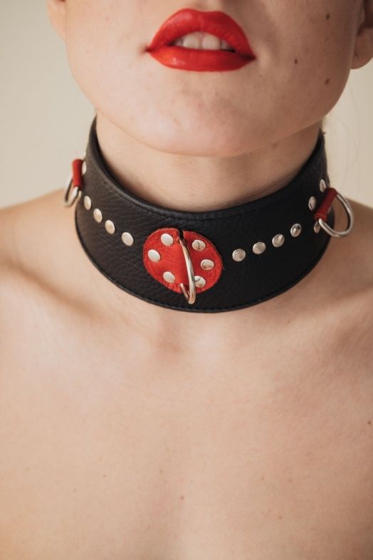 Ошейник с расширением впереди выполнен из качественной натуральной черной кожи, мягкий и комфортный в использовании. На изделии находятся три сварных полукольца. Аксессуар декорирован металлическими заклепками и вставками из красной кожи. Ошейник фиксируется металлическими кнопками, позволяющими подобрать нужный размер, подойдет на обхват шеи от 30 до 36 см. Стильный аксессуар поможет воплотить эротические фантазии в реальность. Ширина - 6 см.