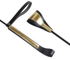 Основа стека - гибкий и прочный углепластик с черным нейлоновым плетёным покрытием. Гладкая и удобная цилиндрическая рукоять обтянута черной кожей с золотой вставкой и имеет удобную черную кожаную петлю для фиксации изделия на запястье (темляк). Окончание-хлопушка выполнено в виде сложенной полоски из плотной натуральной высококачественной кожи черного цвета с золотой контрастной отделкой.<