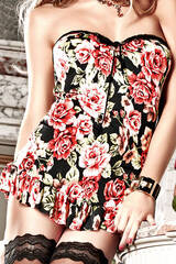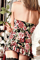 Роскошное море цветов облегает Ваше тело как летний бриз. Черное платьице без бретелек с роскошным узором обрамляется игривыми и романтичными рюшами. Тонкий кружевные края и нежный маленький бантик украшают декольте.