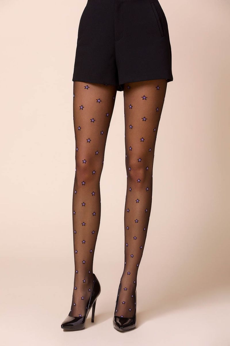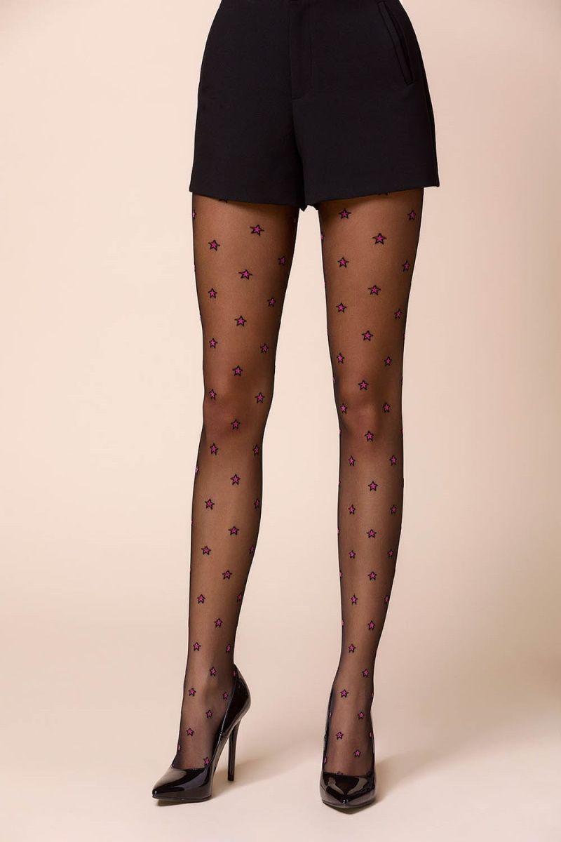 Женские черные колготки Stars с цветными звездочками. Невидимое усиление на пальцах и хлопковая ластовица с плоским швом гарантируют удобство и комфорт использования. Три дизайна на выбор - с ярко-розовыми, фиолетовыми и фиолетово-розовыми звездами.
