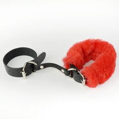 Ремешки наручников изготовлены из натуральной кожи и декорированы съемным искусственным мехом яркого красного цвета.