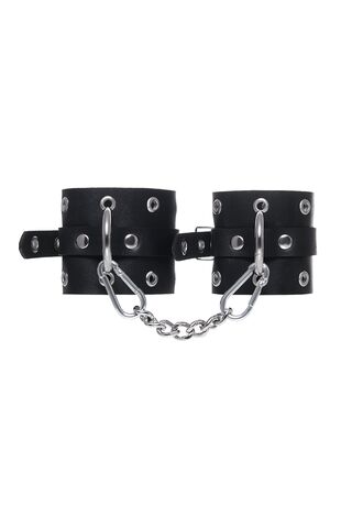 Наличие двух колец и карабинов, соединенных между собой металлической цепочкой, позволяет использовать изделие как раздельно – аксессуар-манжеты, так и как наручники для фиксации. К широким металлическим кольцам также можно присоединить и другие аксессуары при помощи карабинов.