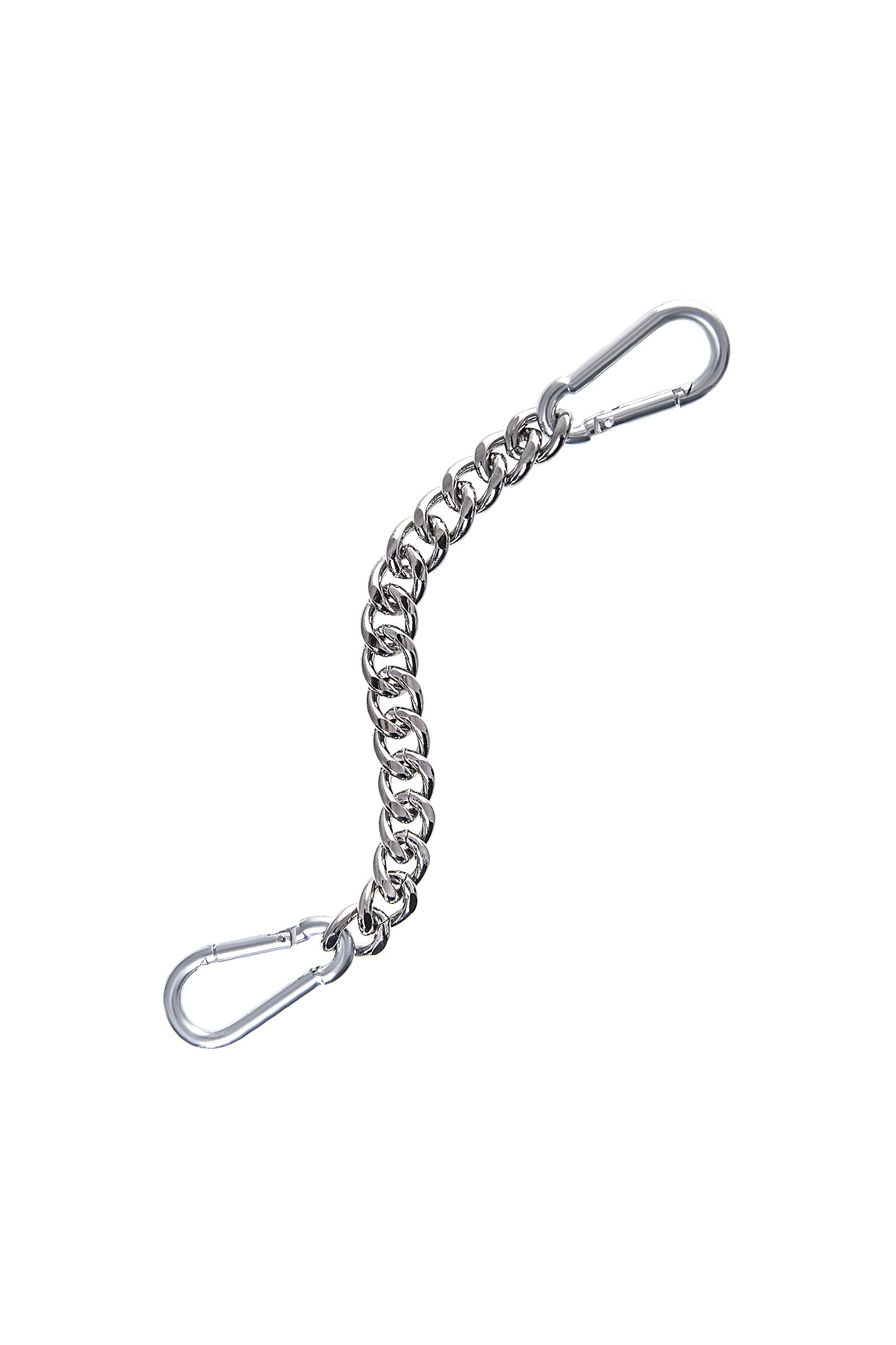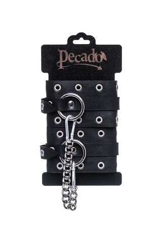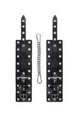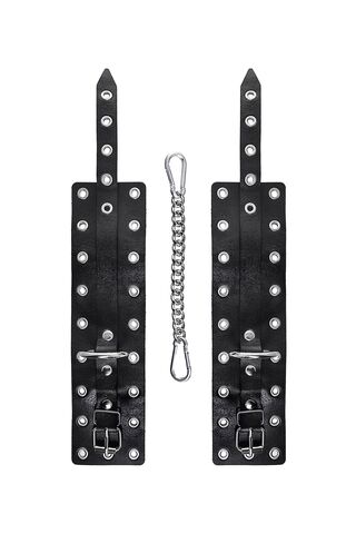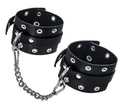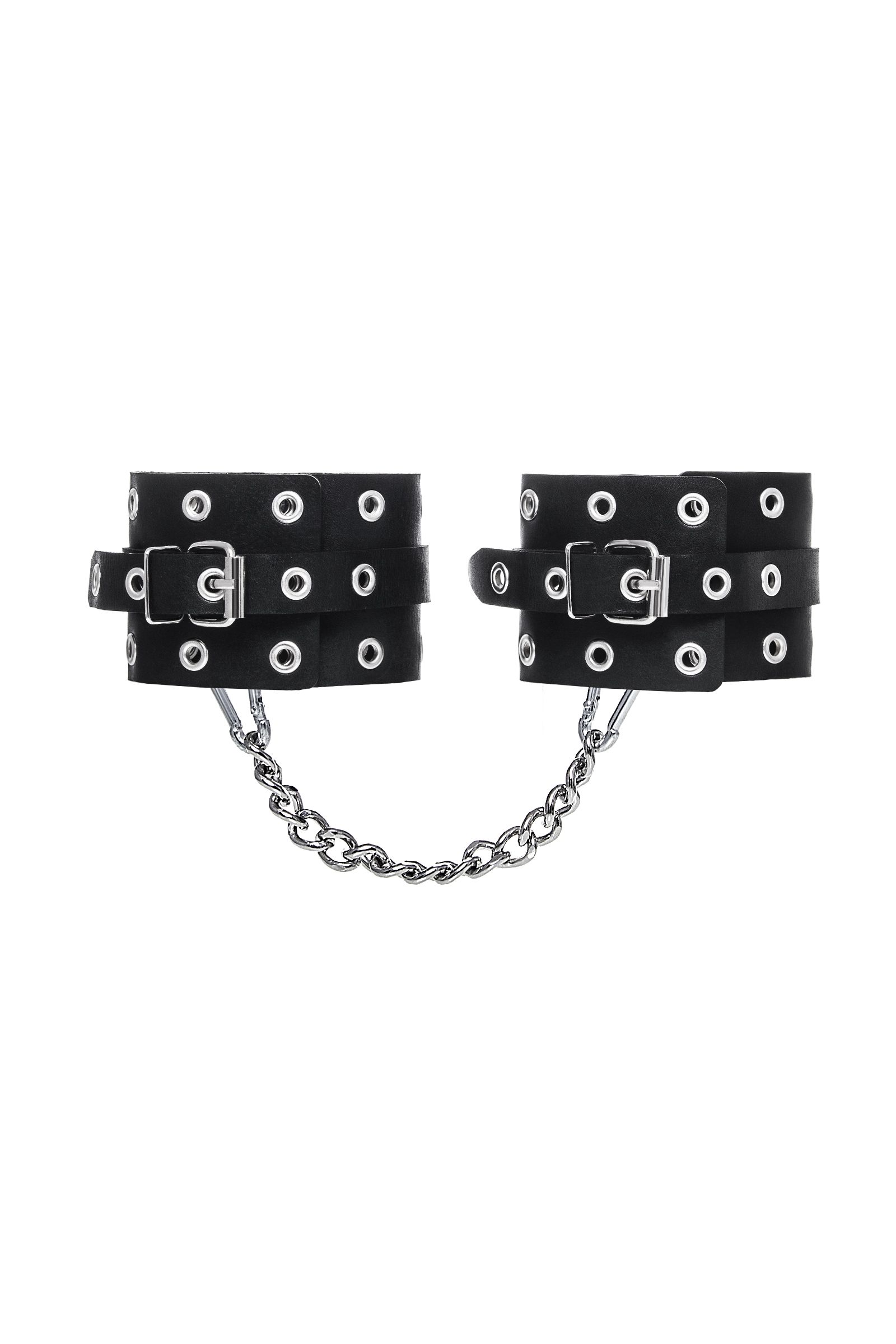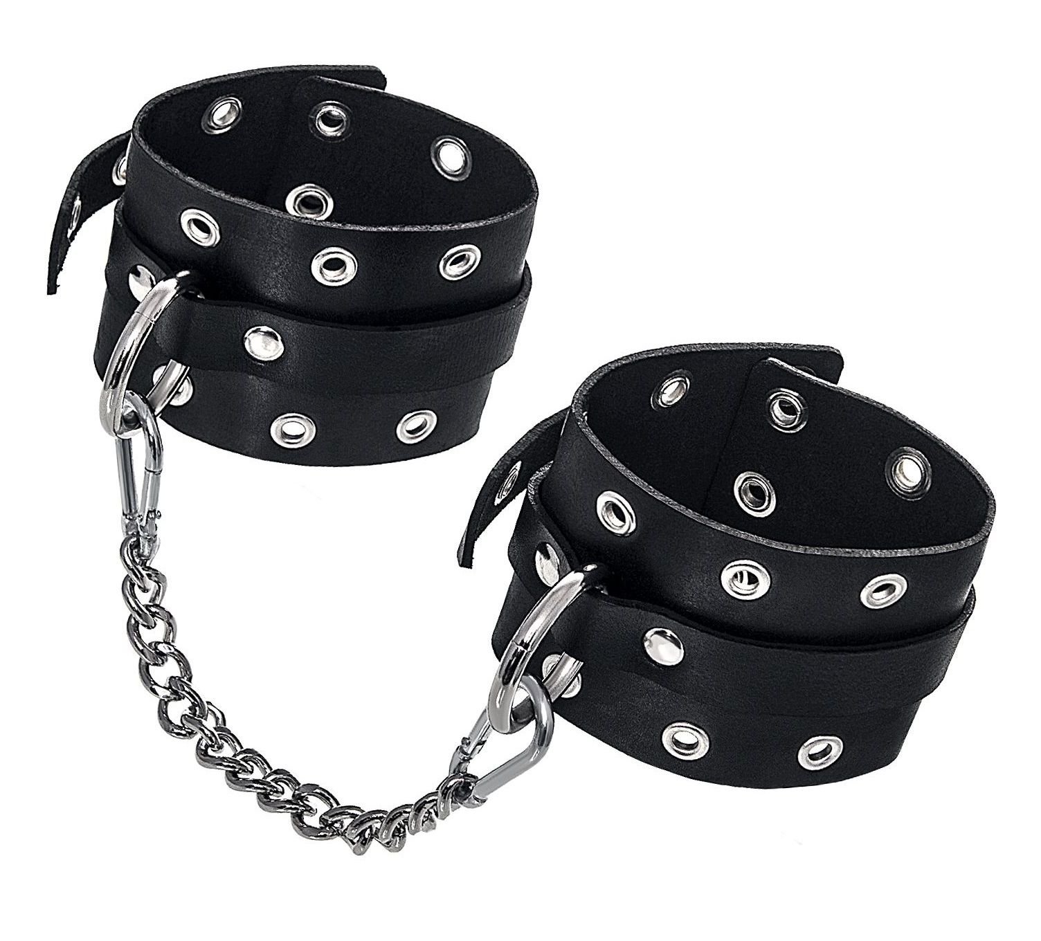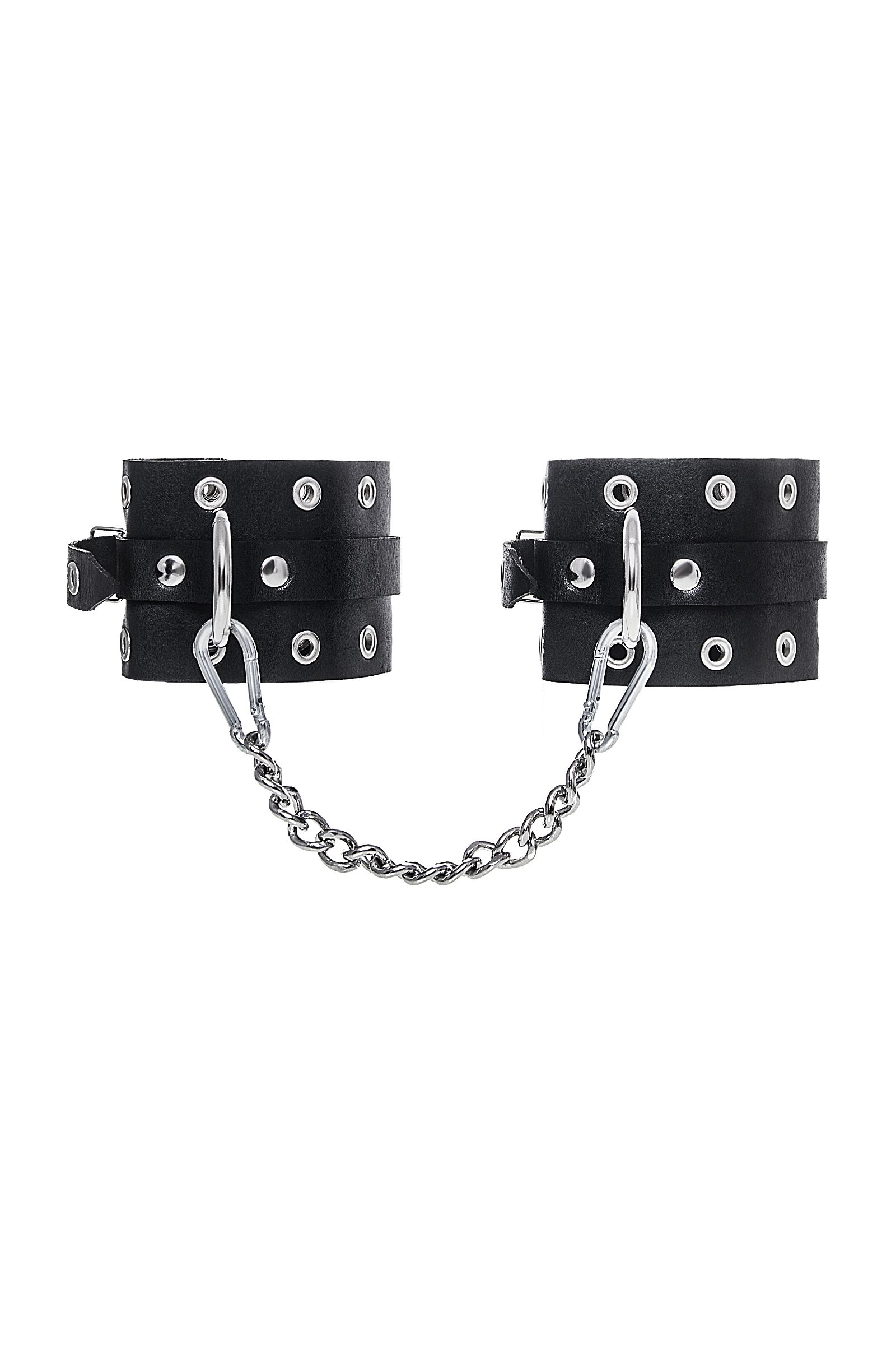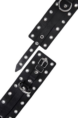 Наличие двух колец и карабинов, соединенных между собой кожаным ремешком, позволяет использовать изделие как раздельно – аксессуар-манжеты, так и как оковы для фиксации. К широким металлическим кольцам также можно присоединить и другие аксессуары при помощи карабинов.