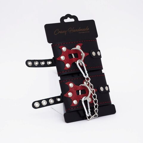 Изделие состоит из двух слоев натуральной кожи : основной слой – лицевая часть, и подкладка красного цвета с мягким наполнителем , которая обеспечивает комфортное и безопасное использование, не натирая кожу. Красная декоративная строчка добавляет изделию стильный акцент, подчеркивая его элегантность. Особый шарм оковам придает элемент в виде трезубца , который вместе с игрой цветов и фактур пробуждает самые смелые эротические фантазии.