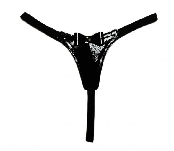 Черные лаковые трусики-стринги с бантиком