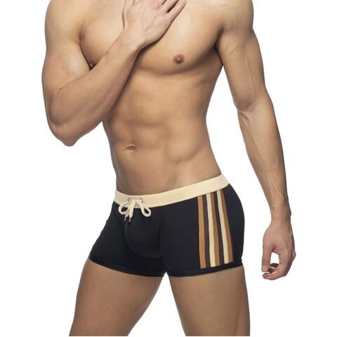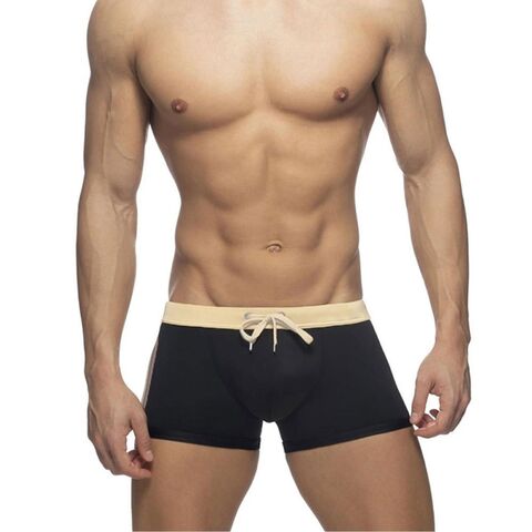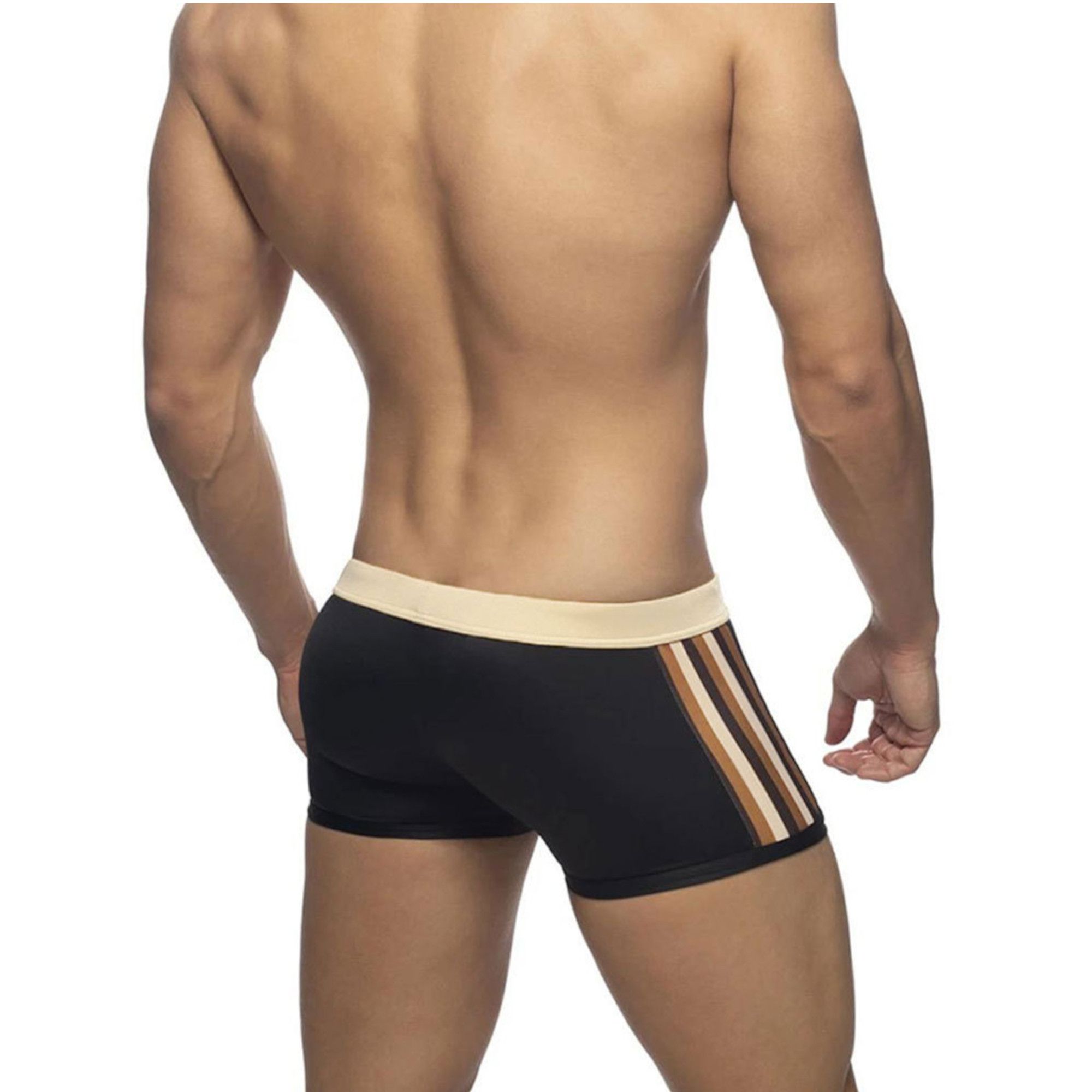 Черные мужские плавки-боксеры с бежевыми полосками по бокам.
