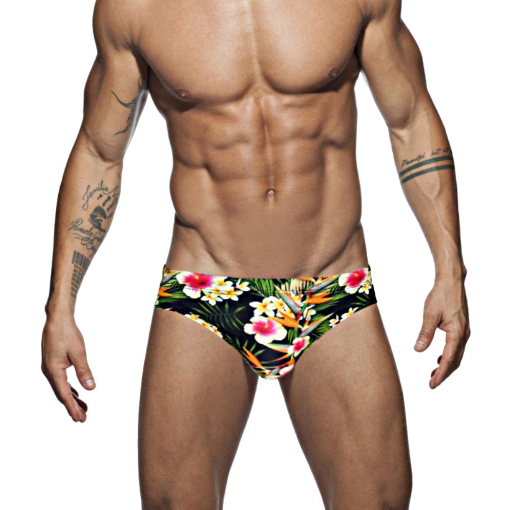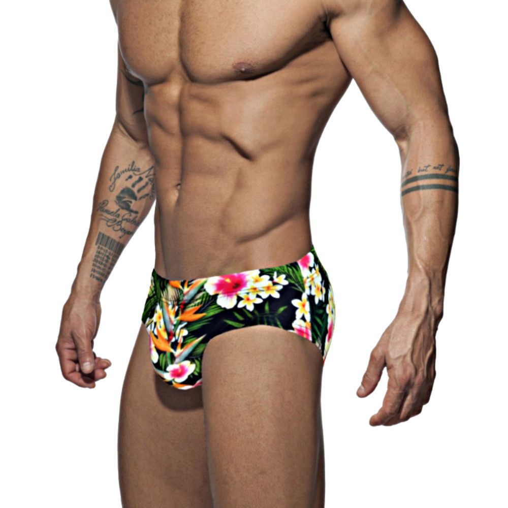 Черные мужские плавки с крупным и ярким тропическим принтом.