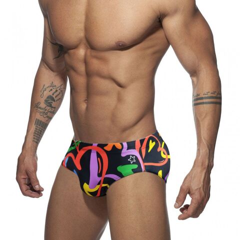 Черные мужские плавки с принтом в виде крупных разноцветных сердец