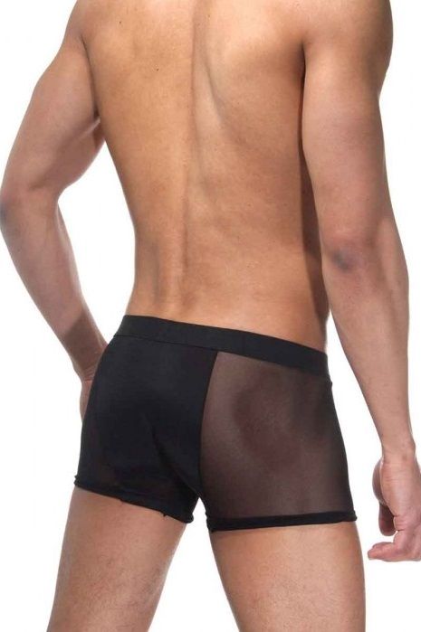 Мужские трусы-боксеры черного цвета с низкой посадкой. По бокам полупрозрачные вставки.