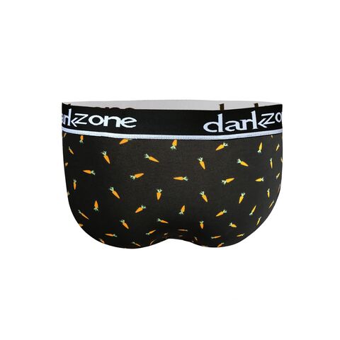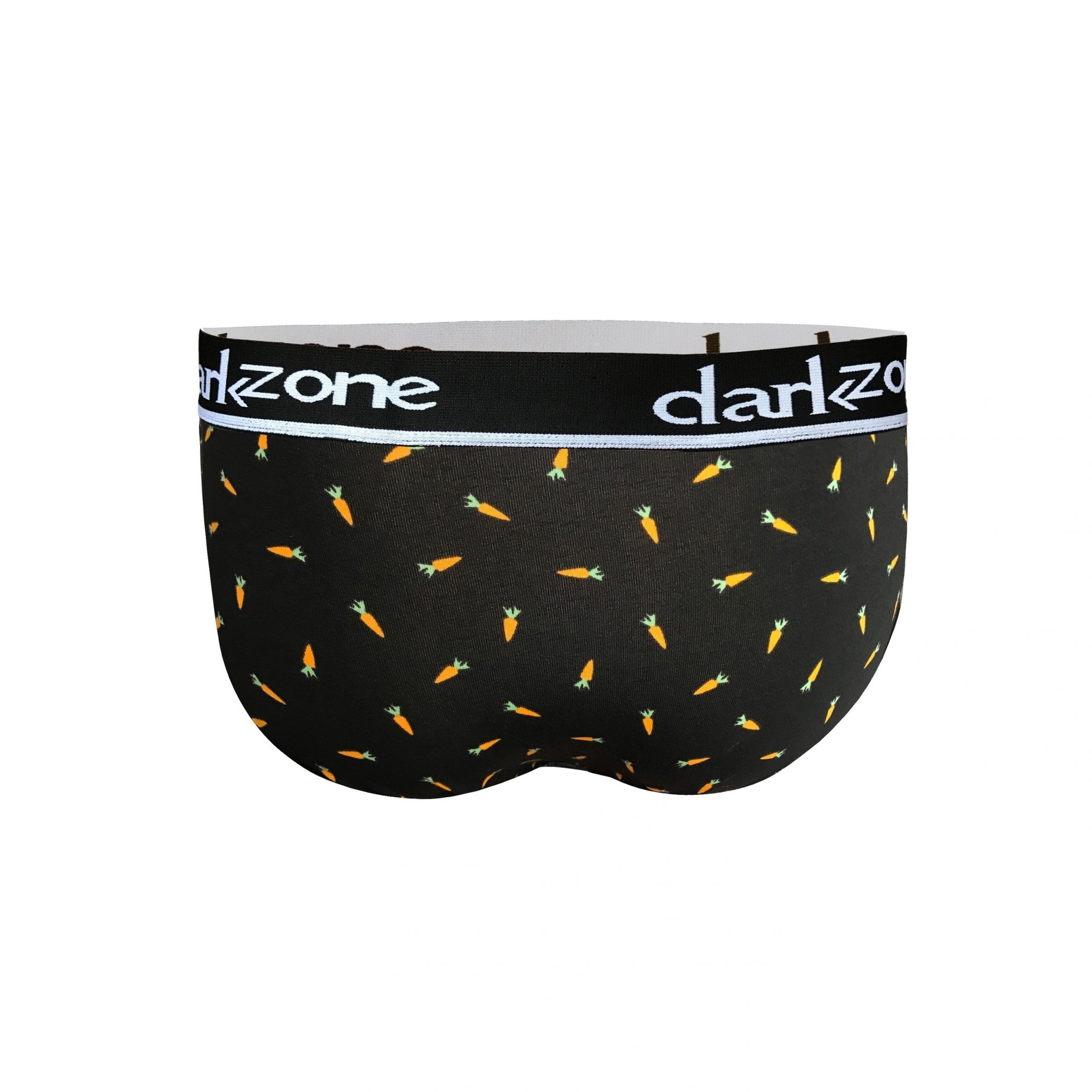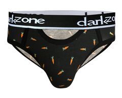 Черные мужские трусы-брифы с вырезом и принтом в виде морковок.
