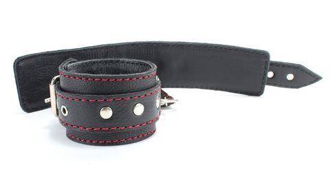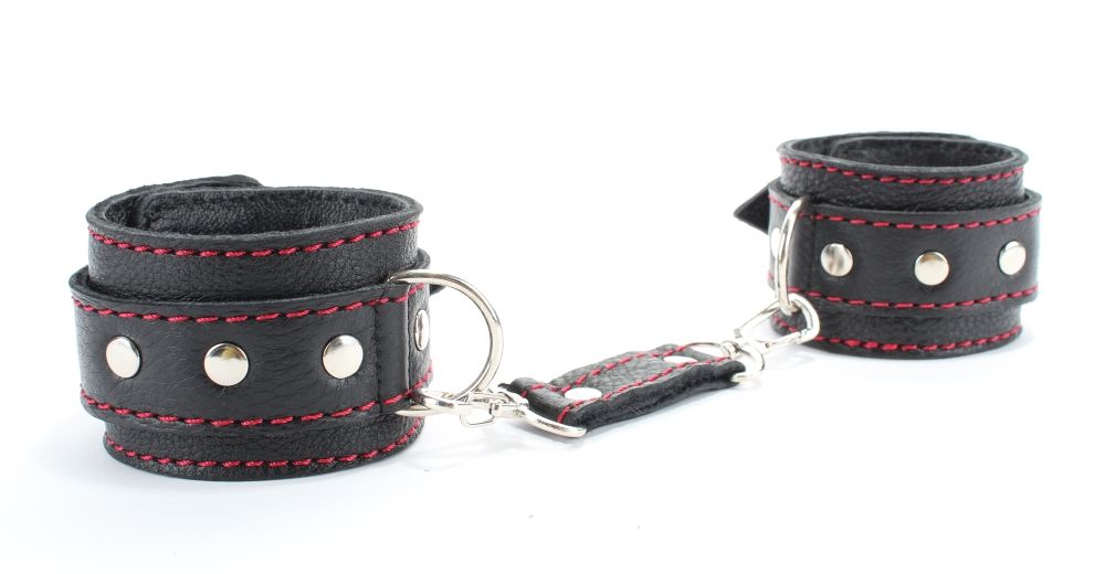 Наручники выполнены из черной натуральной кожи с красной контрастной строчкой. На ремнях украшение в виде металлических холнитенов. Наручники надежно фиксируются пряжками и ремнями, позволяющими выбрать нужный размер, подойдут на обхват руки от 17 до 26 см. Кожаное соединение на карабинах фиксирует наручники вместе. Аксессуар позволяет в полной мере насладиться сексом в стиле БДСМ. Ширина - 5 см.