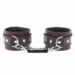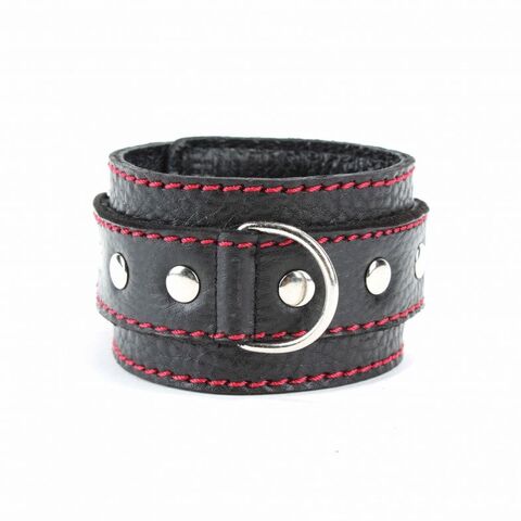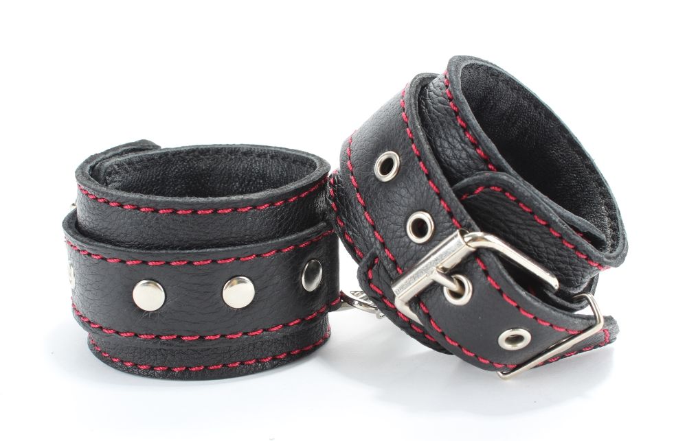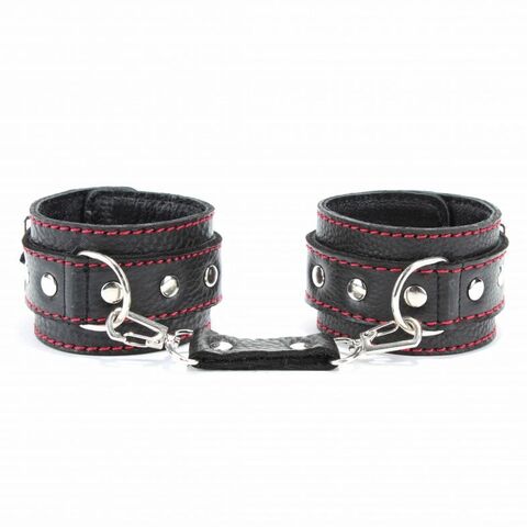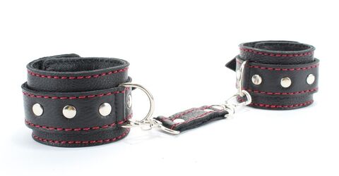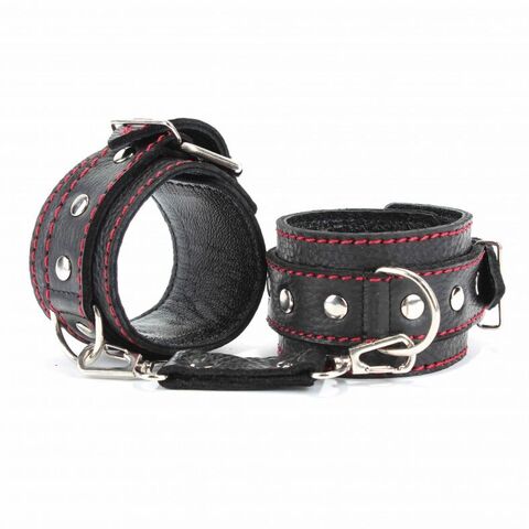 Черные наручники из натуральной кожи с красной строчкой