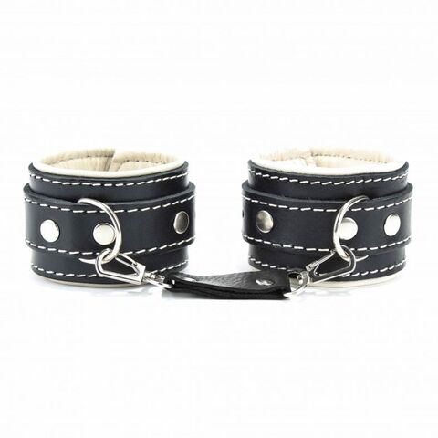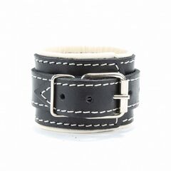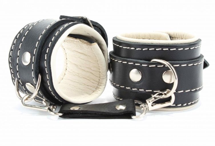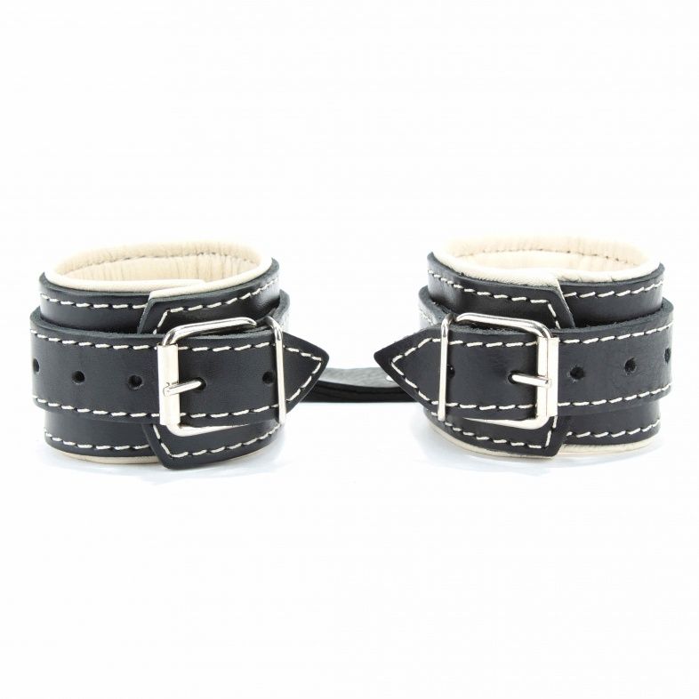Наручники выполнены из толстой ременной кожи с подкладном из светло бежевой перчаточной кожи. Аксессуар декорирован светлой строчкой. Металлическая пряжка крепко удерживает в подчинении, кожаное соединение на карабинах фиксирует наручники вместе. Ремни позволяю выбрать нужный размер, подойдут на обхват от 18 до 25 см. Мягкий подклад обеспечивает комфорт, помогая полностью погрузиться в БДСМ игру. Ширина - 6 см.