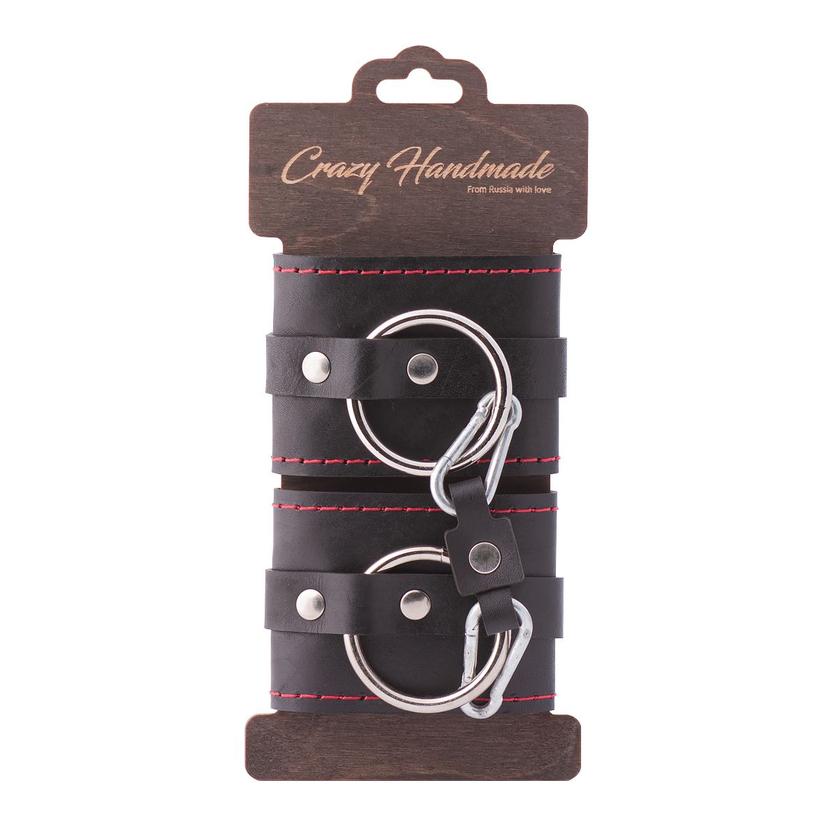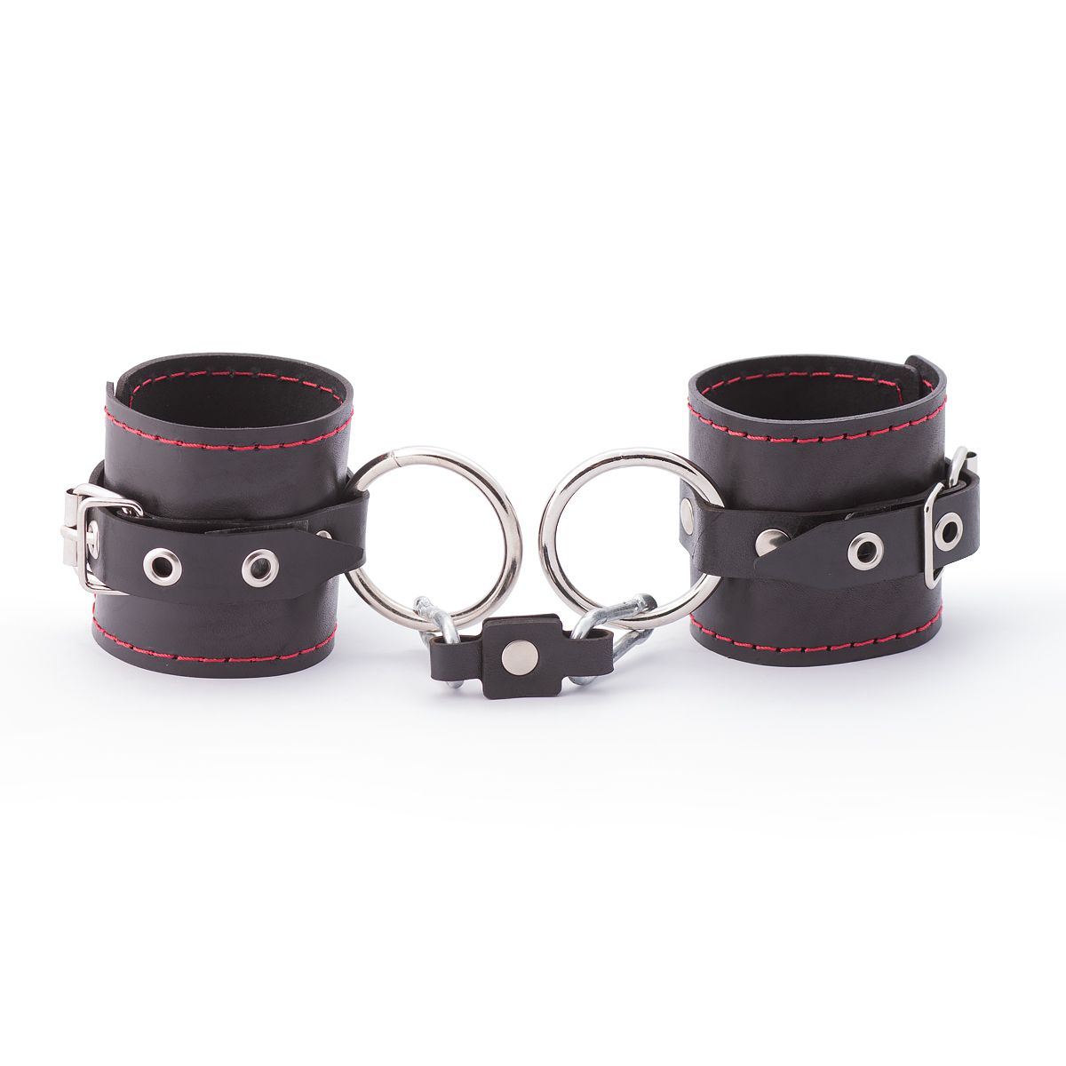 Наручники состоят из одного слоя натуральной кожи, одного ремешка и стального кольца. По краям прошиты декоративной строчкой красного цвета. В комплекте соединительный элемент из кожи с двумя карабинами. Универсальные, подойдут и для использования в любовных играх, и в качестве аксессуара для дополнения образа. Общая длина - 28 см.