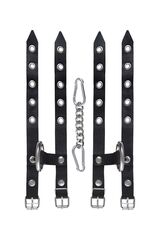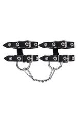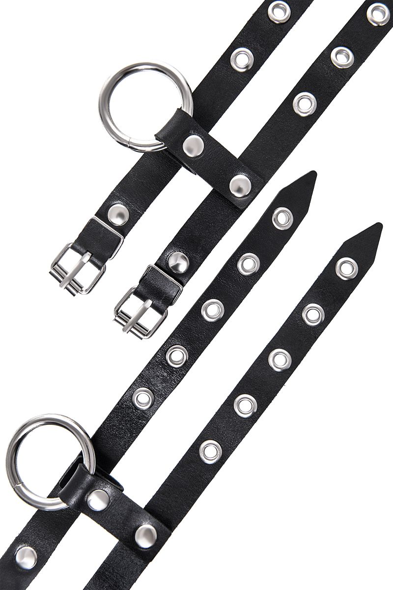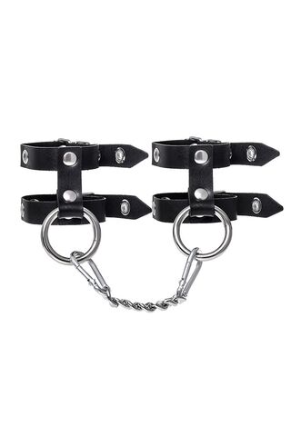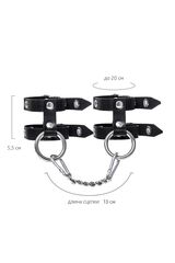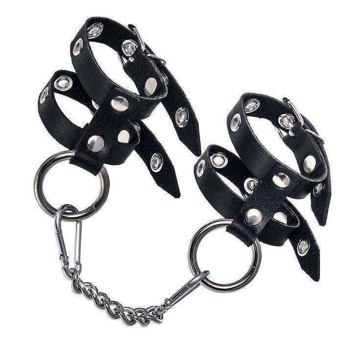Стильный БДСМ-аксессуар изготовлен из черной натуральной кожи полностью вручную. Материал качественный, прочный и тактильно приятный на ощупь. Каждый ремешок по всей длине оснащен пятью металлическими люверсами, чтобы идеально подобрать размер запястья для сабмиссива. Крепкий замок фиксирует необходимый захват. Девайс идеально подходит для долговременного использования. Наручники соединены между собой цепью с помощью надежных карабинов. Ширина манжет - 5,5 см.