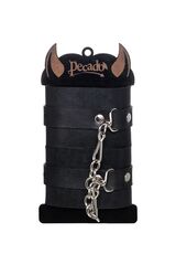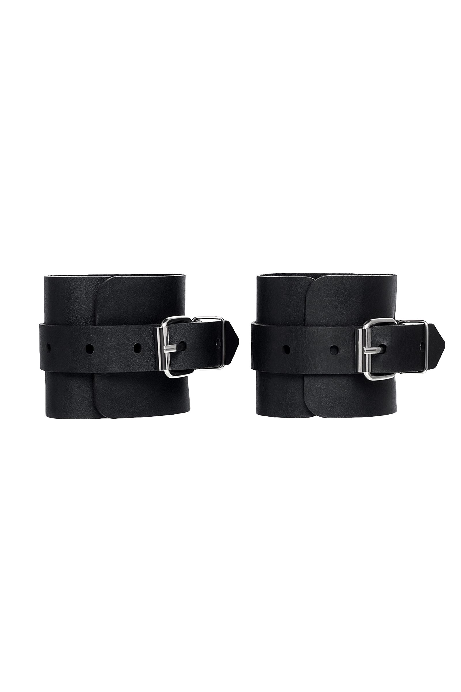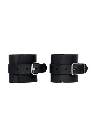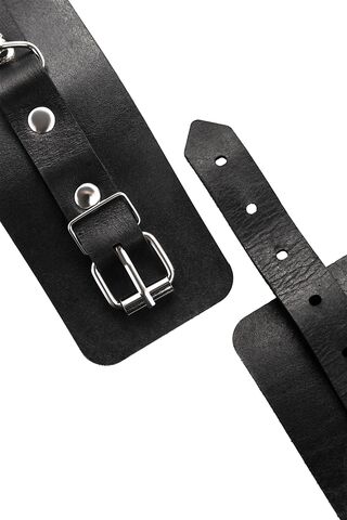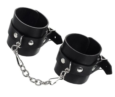 Однослойные кожаные наручники могут стать стильным аксессуаром на «свободных» руках, но могут послужить вашим целям и фантазиям по своему прямому назначению. Наличие двух карабинов и колец позволяет использовать изделие как раздельно – аксессуар-манжеты, так и как наручники для фиксации. К широким металлическим кольцам также можно присоединить и другие аксессуары при помощи карабинов. Благодаря универсальному размеру наручники могут использоваться и мужчинами, и женщинами. Размер легко регулируется с помощью металлических пряжек, органично вписывающихся в общий стиль. Длина манжет - 25 см, ширина - 5,5 см.