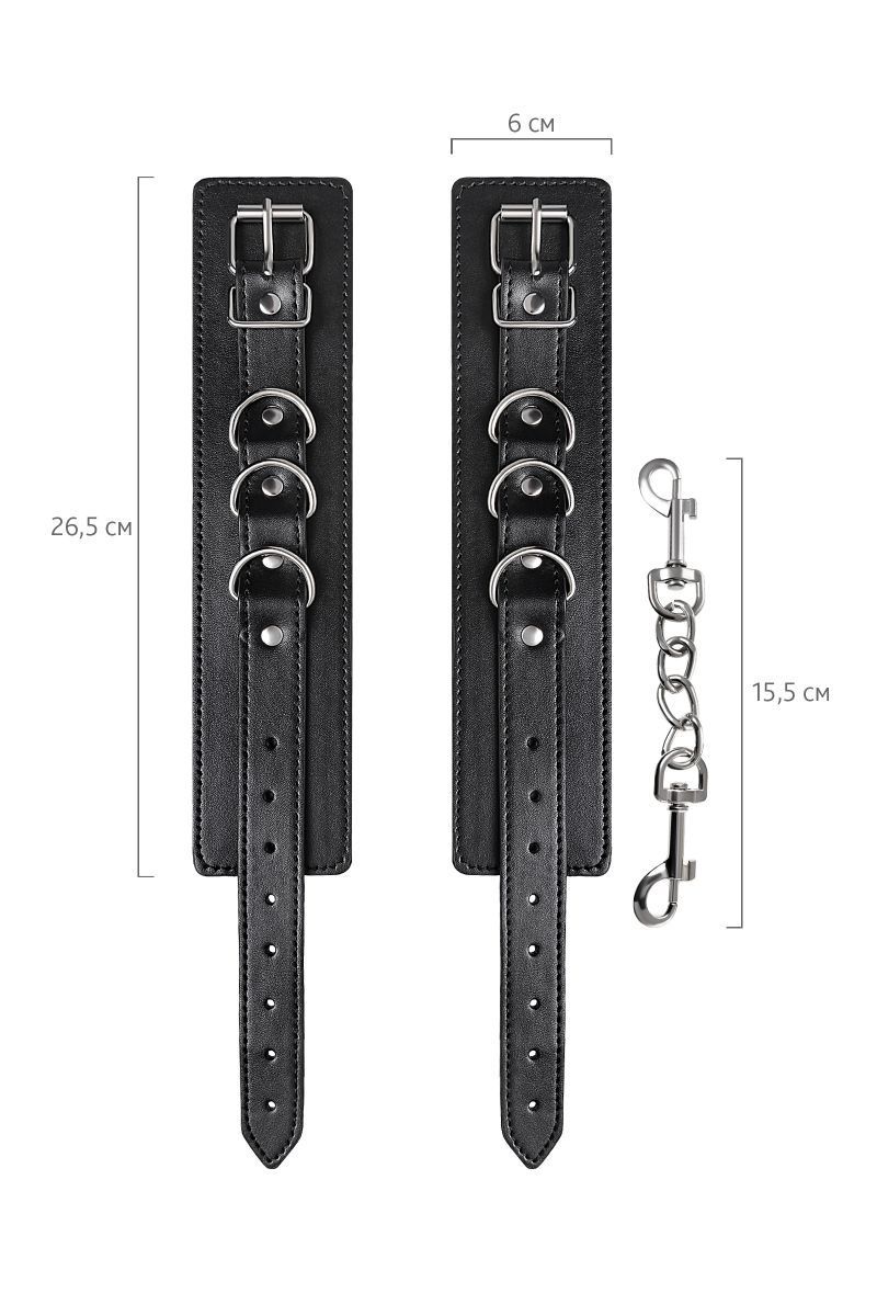 Черные оковы с металлической отделкой – брутальные ограничители свободы. К тому же, они на самом деле весьма жестко обхватывают ноги и надежно соединяют их между собой цепочкой на карабинах. Три кольца для крепления дают возможность дополнить поножи аксессуарами и использовать различные варианты фиксации. Длина оков позволяет использовать их практически на любой размер ног. Отрегулировать размер и силу обхвата легко с помощью ремешка и металлической пряжки. Черные оковы с металлической отделкой – это стиль и функционал. Теперь Доминант покажет, что значит грубое обращение и полный контроль над свободой. Ширина - 6 см.