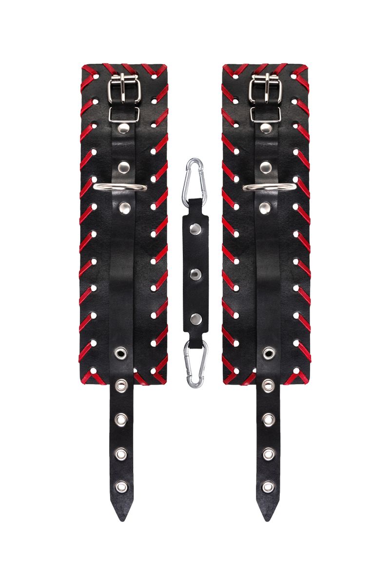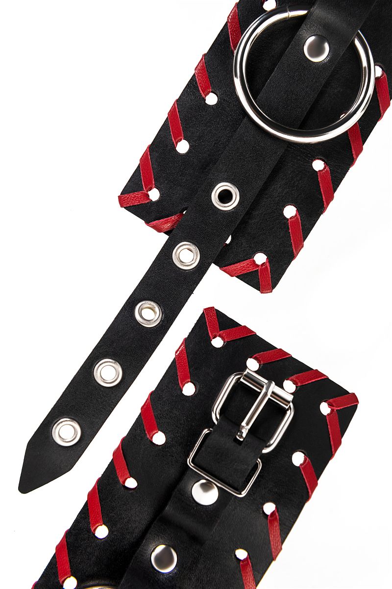 Поддаться всем Вашим смелым фантазиям легко! Вместе с Impirante. В ассортименте бренда особо место занимают оковы. Этот вариант из черной натуральной кожи с красной окантовкой не оставит Вас равнодушными. Прочный материал надежно захватывает щиколотки ног. Внутренняя поверхность аксессуара тактильно отличается от внешней своей выделкой. Пять крепких люверсов на каждом ремешке и замок, надежно фиксируют ноги и обездвиживают сабмиссива. Манжеты оков соединяются между собой стальной цепью. Другие девайсы можно прикрепить с помощью большого металлического кольца и карабинов. Каждая деталь оков сделана с огромным трепетом и вручную. Ширина манжет - 6,5 см.